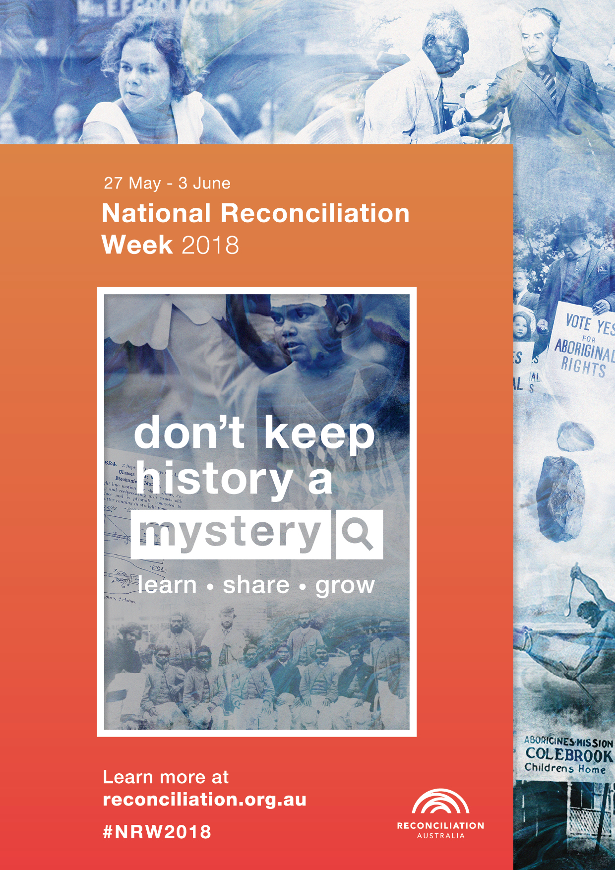 The #NRW2018 poster includes a collection of images that represent a small sample of the rich and diverse histories, cultures and contributions of Aboriginal and Torres Strait Islander peoples. Historical acceptance is one of the five integral and interrelated dimensions of reconciliation in Australia.