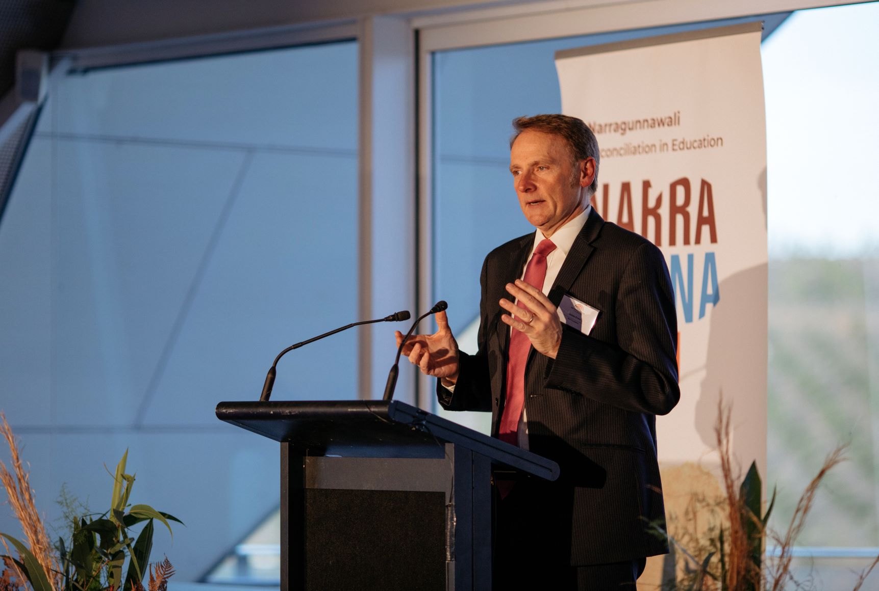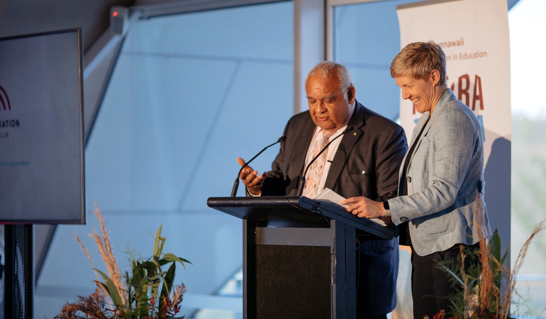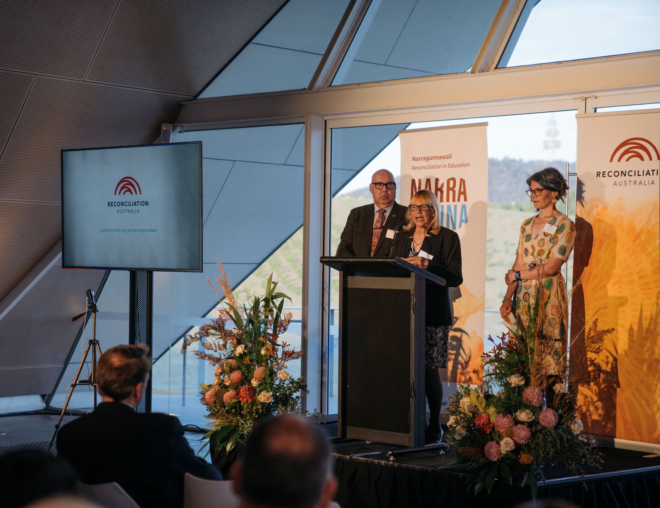 “Our educational institutions have a very important role in advancing reconciliation.” Co-Chairs Professor Tom Calma and Melinda Cilento address the audience at the Narragunnawali Awards 2019.